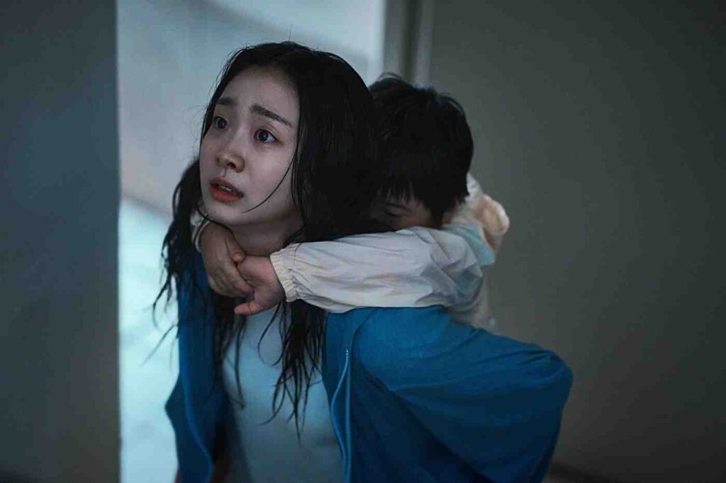 Early sequences root us firmly in An-na’s domestic reality. We see her negotiating the small but exacting demands of motherhood, from Ja-in’s whims to ordinary morning routines. And then the city becomes unrecognizable: what began as a storm escalates into an apocalyptic deluge. Kim’s direction emphasizes the immediacy of danger the water isn’t a distant threat, it’s physical, aggressive, insistent. The screenplay doesn’t linger in mystery about the source of this catastrophe, eventually revealing the planetary crisis behind it, but the early tension is almost exclusively about survival: An-na on the move, Ja-in on her back, stairwell after stairwell, floor after floor, with neighbors clinging to life beside her.